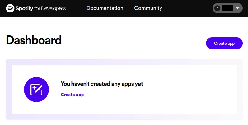 - Click on the “Create app” button in Spotify’s Developer dashboard: https://developer.spotify.com/dashboard/applications: