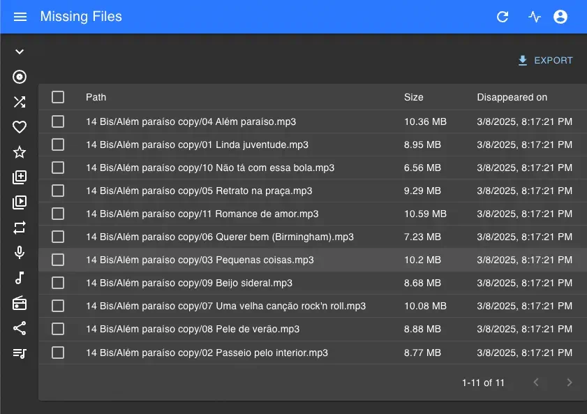 You will see a list of all missing files, with path, size and time they went missing. You will see options to export the list to a CSV file, or delete them from the database: